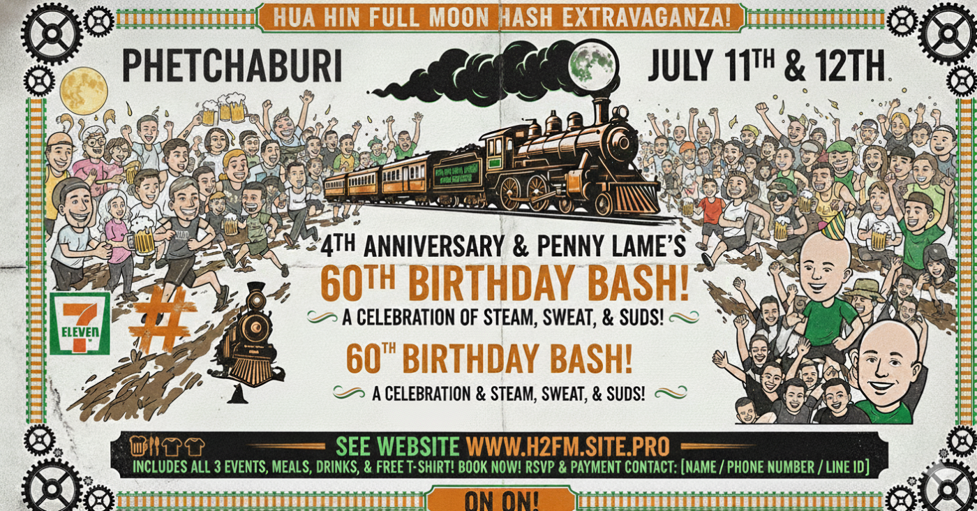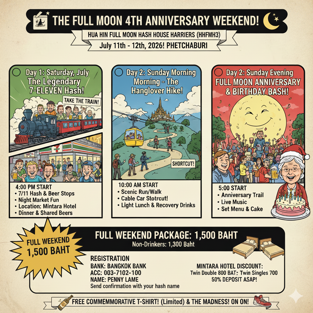 Hua Hin Full Moon Hash 4th Anniversary weekend – full moon run, 7/11 hash, hangover hash, parties and registration details.